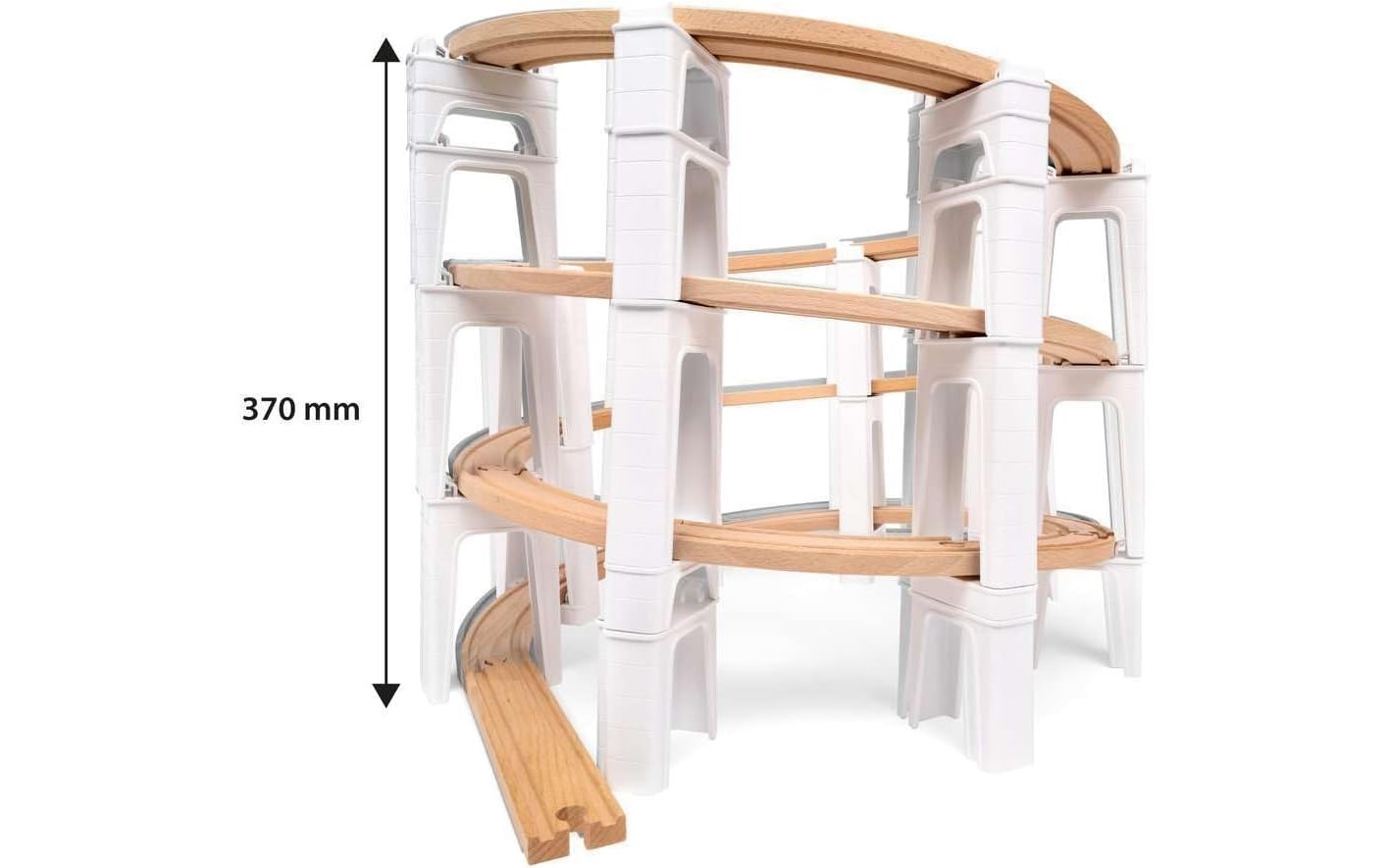 Bring a new dimension to your track with this mega spiral set, featuring 63 pieces which can be used on its own to create two interconnected spirals which you cross between in the air over the double arched bridge or add it to your existing track to make a 4 story spiral, as the support towers interconnect.