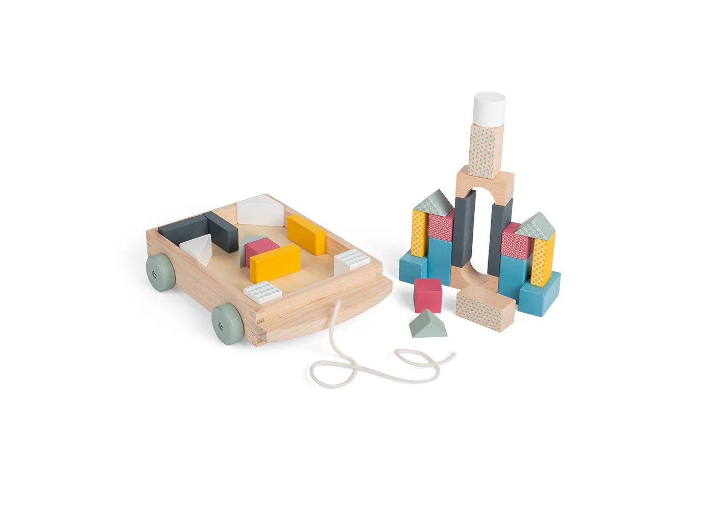 A wooden cart, full of building blocks of different sizes, shapes and colours for you to pull around, then build, stack, model and create with the blocks.