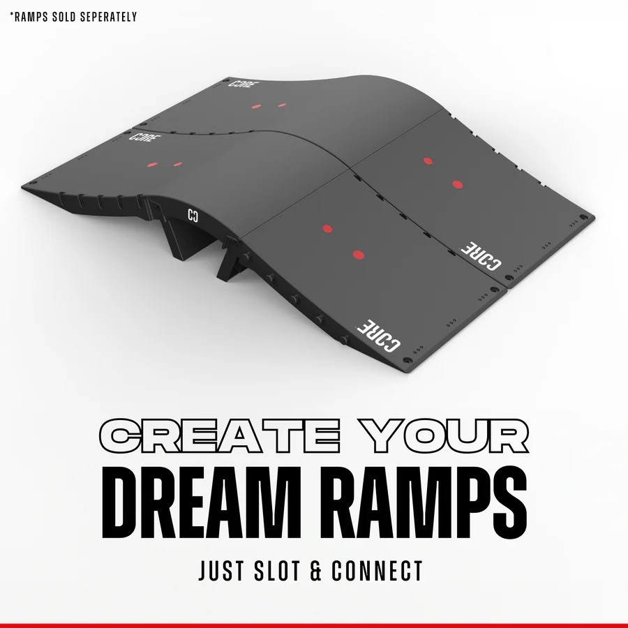 Included 2 x Core Mini Kicker Ramps, 1 Core Wave Bridge Connector, 4 Butterfly Washers to secure the bridge to the ramp, no tools required. The sections are incredibly strong and light weight, for easy set up anywhere, with no tools required, connecting the bridge creates a smooth uninterrupted transition between the kickers.