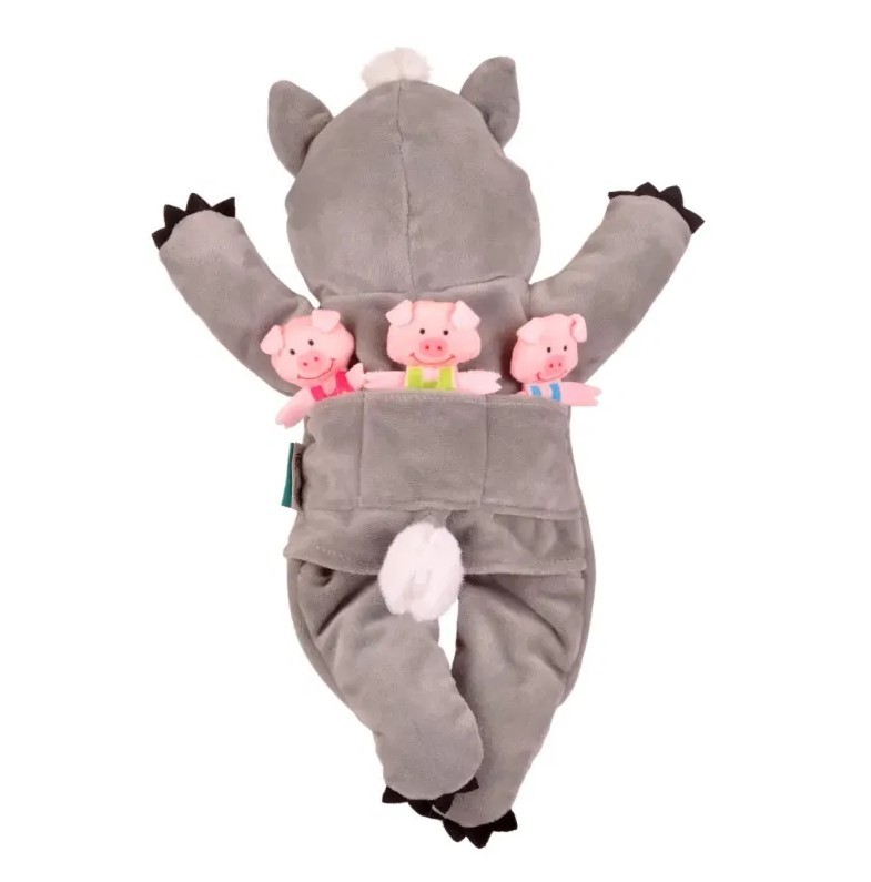 This Wolf Hand Puppet will bring the story to life and promote many other games, stories and fun. Great to have a 'real' wolf in the game How many steps Mr Wolf. Your fingers will move the arms and the hand puppet will fit up to a medium adult hand. To add to the fun, this Hand puppet comes with the 3 Little Pigs as finger puppets. These fit in a pocket on the back of the wolf when not in use.