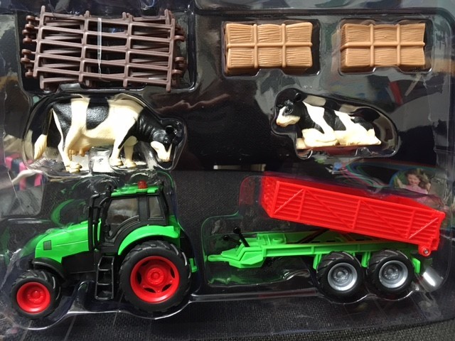 The tractor has a button on its bonnet for you to hear the engine start up and run and see the beacon light flashing on the roof. The trailer can be hooked up to the tractor and tipped up, the back door opens and you can empty its load. One cow is standing grazing and the other is lying down. 6 fences click together to create a pen and the 2 bales will fit into your trailer.