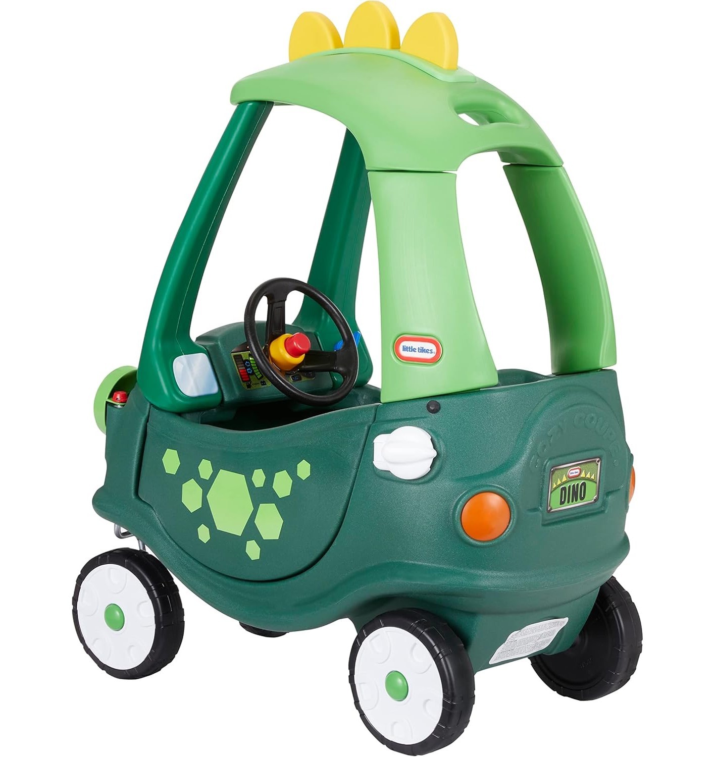 This classic child powered coupe has taken on a whole new look. Take a ride with the Cozy Coupe Dino with scales on the roof and lots of scale stickers, you will look like your traveling in a dinosaur. New style of car with eyes apart.