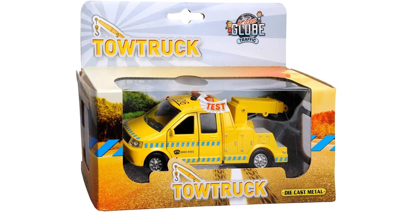 This one is die cast tow truck with a pull back feature, letting it travel across the floor on its own, it has lights and sounds, an opening door, a drop down ramp and winch to take the broken down vehicle to a garage.