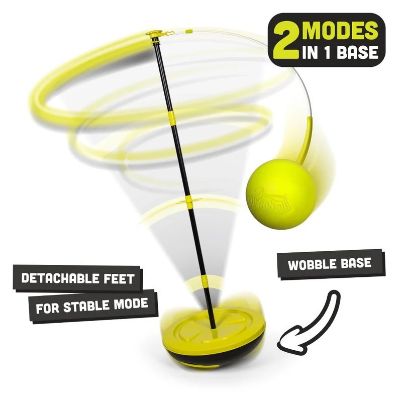 Swingball mode has stabilising feet and the spiral head to play the traditional game of Swingball. Remove the stabilising feet to create a wobble base and the rotary head creates a fast challenging game, for players to test their reaction speed.