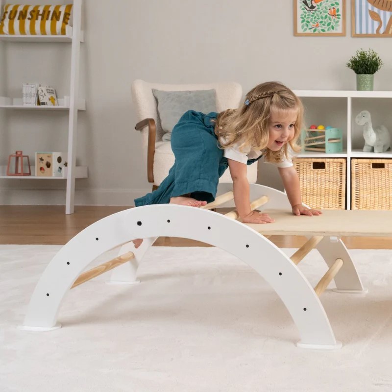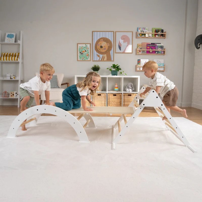 The set includes a Climbing Triangle, Arch and Bridge which is also a slide, all made from FSC Certified natural timber, in natural and white. The